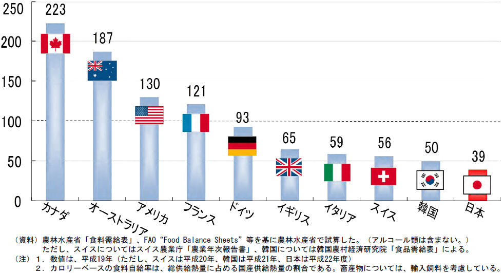 日本の食料自給率(カロリーベース)は先進国の中で最低水準。その食料の約6割を海外に依存。世界の食料市場で他国の食料アクセスに影響を与える立場。食料生産には、土地、水、エネルギー、肥料・飼料、労働力など多くの限りある資源を投入しているが、それを日本が無駄遣いさせている。