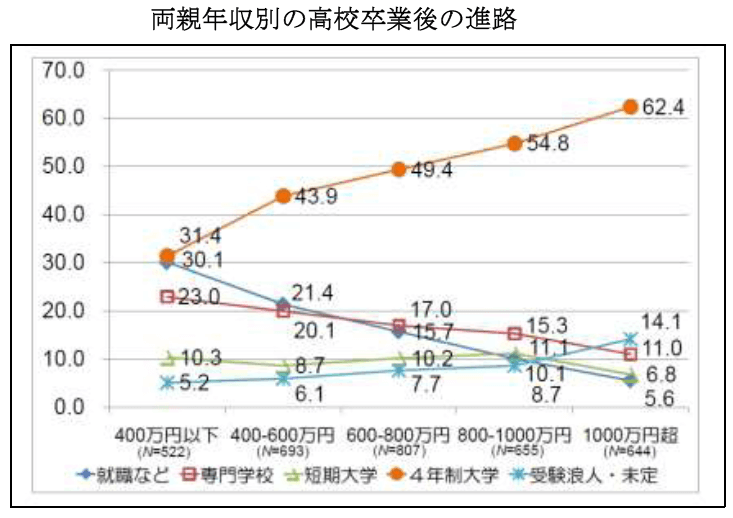 高等学校卒業後の予定進路を両親の年収別にみると、年収が高くなるほど4年制大学に進学する割合が増えることから、両親の年収と子供の進路には正相関があるといえる。世帯タイプ別の進学率でも、全世帯の大学等(短大・専門学校含む)の現役進学率が73.2%である一方、ひとり親世 帯では41.6%、生活保護世帯では33.4%、児童養護施設児童では23.3%と差が大きい。さらに現在では大学生の半数が返済義務のある奨学金を借りていて、満足な食事をしていない学生が増えている。